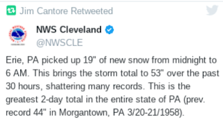 Erie PA is a done deal and they are probably so done with snow as of December 26th and as the temperatures will be cold for a long time ... snow will remain on the ground. American, United and Delta have flights to Erie so if you want to see snow then you may want to book a ticket to Erie to build snow people ;) however you may want to wait until they dig out a bit. Wouldn't you just figure record rainfall during the Hurricane Season would segue into record snow totals before the 2017 year ends. To add to the "I've seen fire and I've seen rain" we can now say Santa Claus definitely let it snow, snow, snow in Erie.